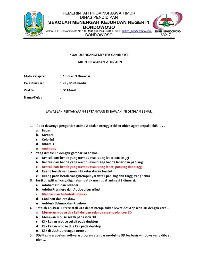 2d dan 3d doc, soal essay animasi 3d, soal uas animasi 3d,. Pada soal pilihan ganda,pilihlah jawaban yang kamu anggap paling benar. Animasi yang terlihat nyata itulah yang disebut dengan animasi 3d. Doraemon, scooby doo, looney tunes merupakan jenis animasi yang tergolong…. Soal dan jawaban animasi 3 dimensi kelas 11 semester 2, soal dan jawaban.